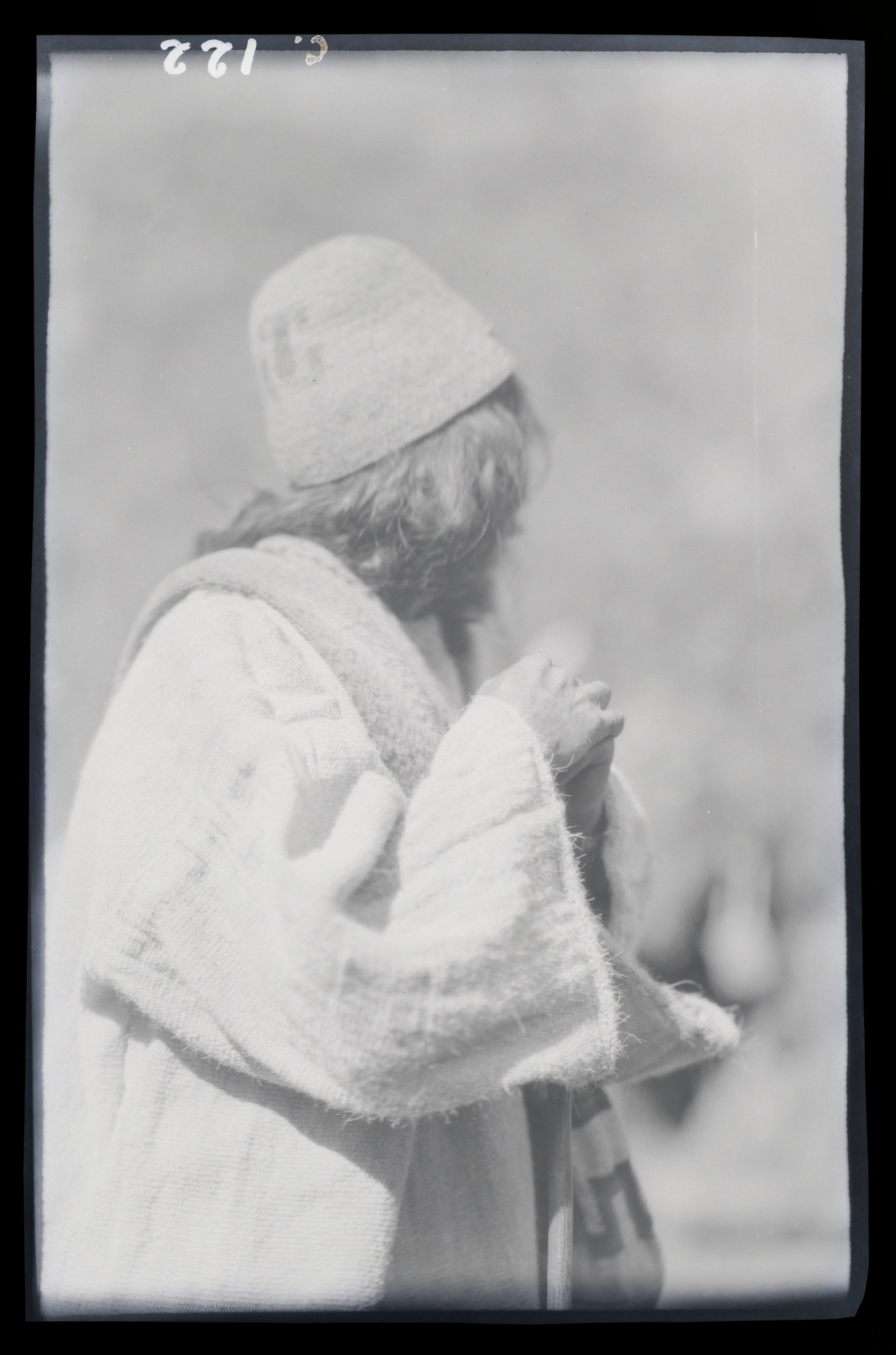 | dc.description.abstract | The photograph shows a man with a blanket that has wide and long sleeves. He is holding a stick and is looking at his left side. | spa |