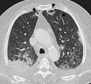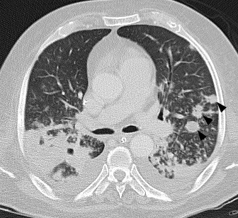 Paciente masculino de 70 años de edad con EPS asociada a artritis de cadera derecha por Staphylococcus aureus meticilino-resistente.La embolia pulmonar séptica (EPS) se define como la presencia de trombos sépticos en la circulación pulmonar provenientes de un foco infeccioso extrapulmonar. La obstrucción del flujo en vasos de pequeño calibre (secundaria a la presencia de émbolos infecciosos en la luz del vaso), puede condicionar el desarrollo de infartos y abscesos pulmonares.Las entidades asociadas a EPS son de naturaleza variada e incluyen: infecciones asociadas a dispositivos intravasculares, endocarditis infecciosa, abscesos hepáticos, infecciones en piel y tejidos blandos, tromboflebitis séptica, síndrome de Lemierre e infección periodontal. Los microorganismos aislados con mayor frecuencia son: cocos gram positivos (Staphylococcus aureus, Staphylococcus coagulasa negativo, Streptococcus spp.) y bacilos gram negativos (Fusobacterium, Klebsiella pneumoniae).Las manifestaciones clínicas de EPS son inespecíficas (fiebre, disnea, tos, dolor torácico pleurítico y hemoptisis).Las alteraciones en los estudios de imágenes son esenciales en el diagnóstico de EPS.En la radiografía de tórax de pacientes con EPS se describen opacidades nodulares, consolidación, lesiones cavitadas y derrame pleural.La tomografía computarizada (TC) es la imagen de mayor utilidad en la valoración de pacientes con sospecha de EPS. Las manifestaciones de EPS en TC se describen en la Tabla 1.